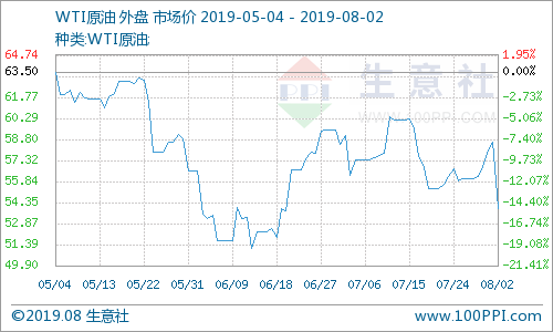 8月1日,受中美貿(mào)易戰(zhàn)談判再度陷入僵局以及美聯(lián)儲(chǔ)降息提振美元走強(qiáng)影響,美國(guó)WTI原油期貨市場(chǎng)價(jià)格暴跌,報(bào)53.95美元/桶,跌幅為4.63美元,布倫特原油期貨價(jià)格暴跌,報(bào)60.50美元/桶,跌幅為4.55美元。美國(guó)原油期貨重挫7%,創(chuàng)6周以來(lái)的最低收盤價(jià)。布倫特原油期貨價(jià)格下跌超過(guò)6%,創(chuàng)七周以來(lái)最低收盤價(jià),同時(shí)創(chuàng)2016年2月以來(lái)的最大單日跌幅。
